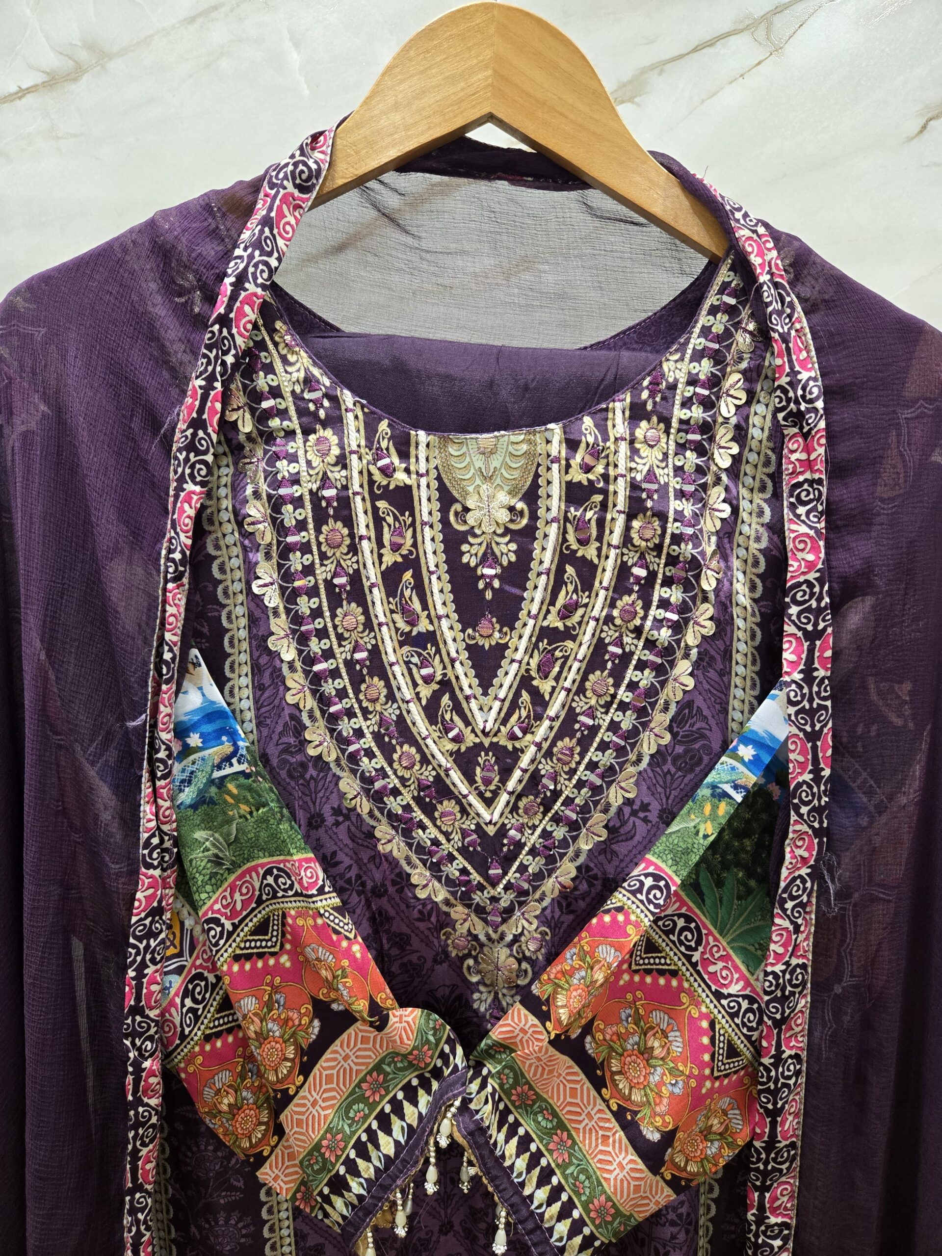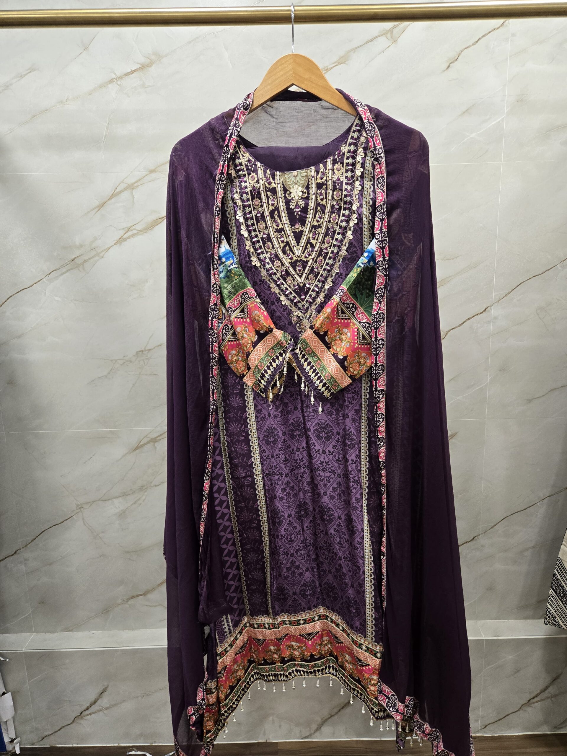 Elevate your ethnic charm with this elegant pure muslin silk A-line kurti, beautifully adorned with intricate handwork that exudes timeless grace. The outfit features a soft cotton lining for all-day comfort, ensuring a perfect balance of luxury and ease. It is paired with a graceful pure chiffon dupatta that adds fluid elegance to the look, and matching santoon silk pants that complete the ensemble with finesse. Perfect for festive occasions, celebrations, or elegant gatherings, this set embodies refined sophistication and effortless style.