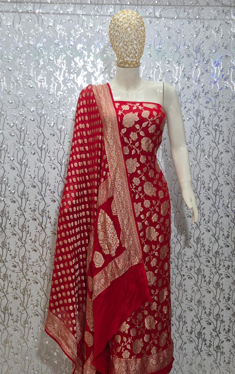 Experience timeless elegance with our Pure Red Khadi Banarasi Unstitched Suit Set. Crafted with a pure Banarasi chiffon top that radiates rich texture and intricate woven beauty, this ensemble exudes regal charm. The lightweight chiffon dupatta complements the outfit with its graceful drape, while the soft plain crepe bottom ensures comfort without compromising sophistication.